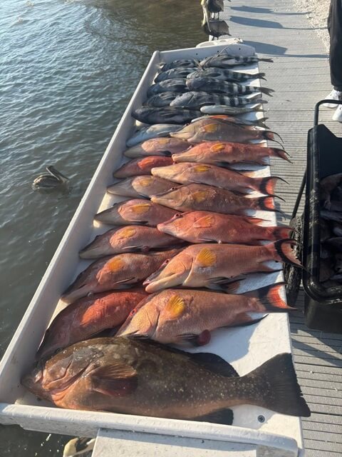 Your Fishing Report: If this is a tournament report do not state the fish’s length in this box. State the length and species in the box below Thursday Mike Spanhel Terry  Reelitz, Bob Cohen and his wife Sharon a gentleman named Barry and myself went offshore with Captain Carlos targeting Hog Fish. We caught not only Hog Fish but a ton of nice size Grunts, Red and Gag Grouper, mangrove Snapper and Trigger fish. Just a bit choppy on the way out but settled down pretty much as we started fishing. We were fishing at 30-50 depths. Captain Carlos and his 1st Mate Jeremy move around as needed. The only bait we used was small chunks of squid to get the bite going then small pieces of shrimp. Everyone caught there share of Grunt and hog fish with 10 keeper Hogs! And many more under size. I caught what I still swear was at LEAST a 40” gag but my fishing partners said the ruler showed 31.5”. A great fish on a hog fish rod set up. A great day on the water!